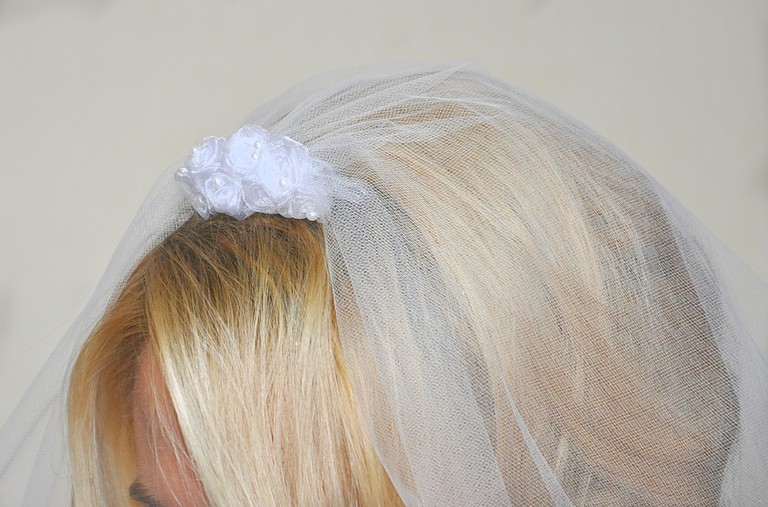 Piękny welon biały 70/80cm, dwuwarstwowy NOWY dekorowany różyczkami i perełkamiAkcesoria ślubne » Pomorskie » Gdynia