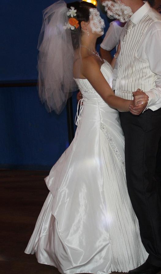 Witam. Sprzedam suknię ślubną zakupioną w salonie MS Moda. Jest to bardzo elegancki kobiecy fason, który znakomicie podkreśla talię. Tył sukni jest sznurowany oraz dodatkowo zapinany na zamek, dzięki regulacji bez problemu powinna pasować na rozmiar 36 albo 38. Całość sukni wykonana jest z tafty włoskiej w kolorze jasnego ecru. Góra jest delikatnie marszczona oraz usztywniona na fiszbinach co sprawia, że suknia świetnie się trzyma podczas tańca. Elementy sukni są wykonane z plisowanego materiału. Ma podpinany tren, dzięki czemu po podpięciu jest on całkowicie niewidoczny.