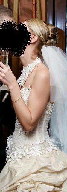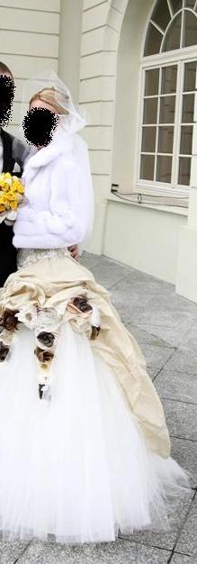 Suknia dwuczęściowa, w kolorze ecru + złoty+biały, gorset z koronki zdobiony koralikami i złotą nitką, dół z tafty i tiulu, pięknie ozdobiony kwiatami. Suknia posiada przepiękną ozdobę na szyję. Do sukni dołączam gratis welon dwuwarstwowy. Rozmiar sukni: pasuje na osoby noszące rozmiar od 34 do 38. Suknia do obejrzenia we Wrocławiu. Więcej zdjęć mogę przesłać na maila.