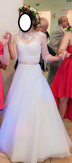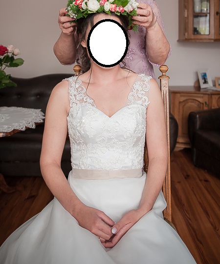 Sprzedam suknię ślubną. Suknia jest prosta, w kolorze ivory. Tiulowy dół, koronkwo-kwiatowa góra, brudnoróżowy paseczek podkreślający talię, zakończony kokardką. Suknia zapinana na zamek. Ramiączka z siatki, cała góra zdobiona cekinami Swarovskiego.