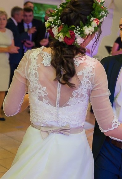 Do sukni dołączam również bolerko, które było szyte I dopasowywane do tego modelu sukni. Jest ono z siatki z naszytymi motywami kwiatowymi, zlewającymi się ze zdobieniami sukni.