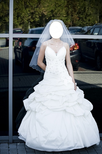 - Długi tren można podpiąć haftkami przymocowanymi do sukienki.