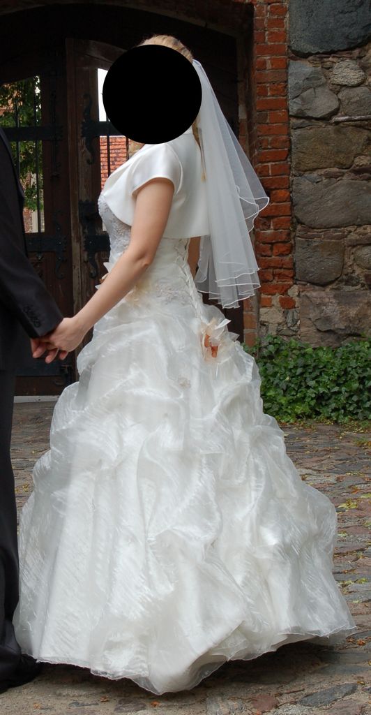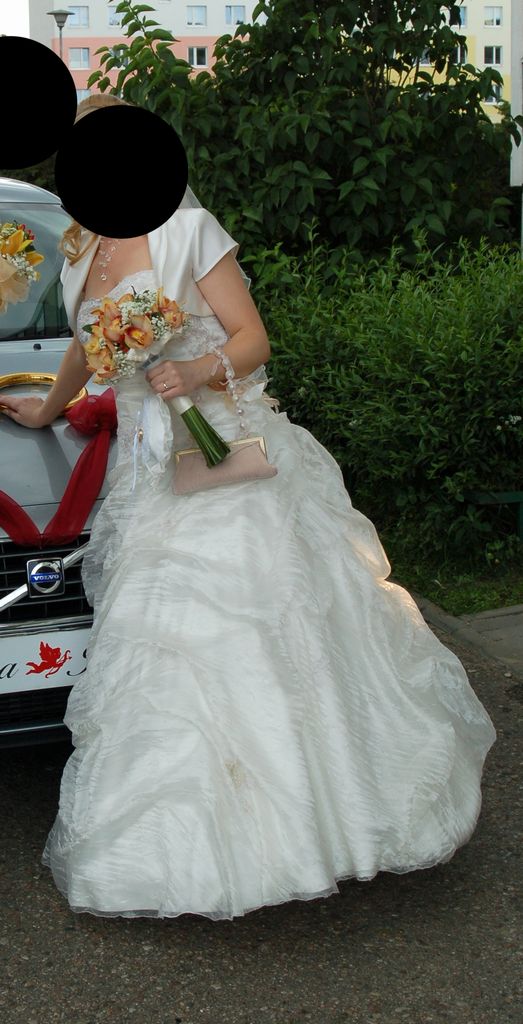 Sprzedam śliczną suknię ślubną jednoczęściową, sznurowaną z tyłu, rozmiar 36, wzrost 162 cm + obcas 4 cm. Kolor ecru - waniliowy, z tyłu i z boku kwiat z płatkami w kolorze kremowym z odrobiną pomarańczu. Od pasa w dół - lekki, połyskujący materiał. W komplecie bolerko i halka,
