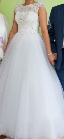 Sprzedam suknie ślubną w rozmiarze M/38 użytą raz. Suknie jest w kolorze białym na 172 cm plus 10 cm obcas. Bez problemu można suknie skrócić, dlatego zachęcam również osoby niższe. Obecnie jest po praniu. Druga warstwa tiulu jest pokryta brokatem, z tyłu częściowo wiązana, częściowo zapinana na guziki. Wykończona perfekcyjnie. Uszyta z bardzo dobrych jakościowo tkanin. Jeśli w dniu swojego ślubu chcesz poczuć się jak prawdziwa księżniczka suknia ta jest dla Ciebie idealna. Suknia robi wrażenie na gościach. Góra sukni bogato zdobiona perełkami i kamieniami co jest doskonale widoczne na zdjęciu. WELON GRATIS!