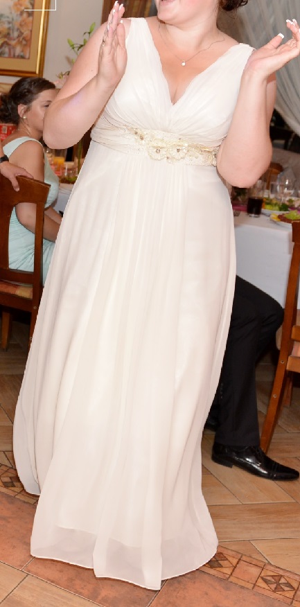 Sprzedam suknię ślubną szytą w salonie sukien ślubnych na rozmiar 44-46. Suknia jest lekka i zwiewna. Odcinana pod biustem, z wiązaniem gorsetowym. Pas ozdobiony motywem kwiatowym. Suknia ma odcień ecru. Idealnie maskuje niedoskonałości. W komplecie jest delikatny szal do okrycia ramion. Suknia posiada specjalne oczka przez które można przełożyć szal. Dodatkowo posiada dwie halki dzięki czemu nie widać bielizny mimo lekkiego materiału. Jedynym mankamentem jest lekko naderwana przy szwie halka na dole sukni. Jest to bardzo łatwe w naprawie. Więcej informacji priv.