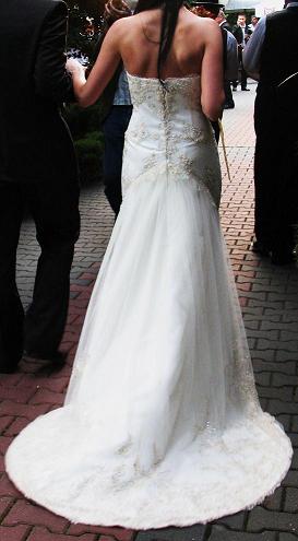 Suknia jednoczęściowa ze stójką z koronki ( możliwość odprucia stójki, zostala doszyta na moje życzenie ). Stanik usztywaniany, profilowany.Wyszywana ręcznie drobnymi koralikami, perełkami i ozdobnymi haftami. Pięknie podkreśla figurę.Suknia posiada piekny, bardzo łatwo podpinany na guziczek, tren. Po podpięciu suknia nadal wyglada bardzo efektownie.
