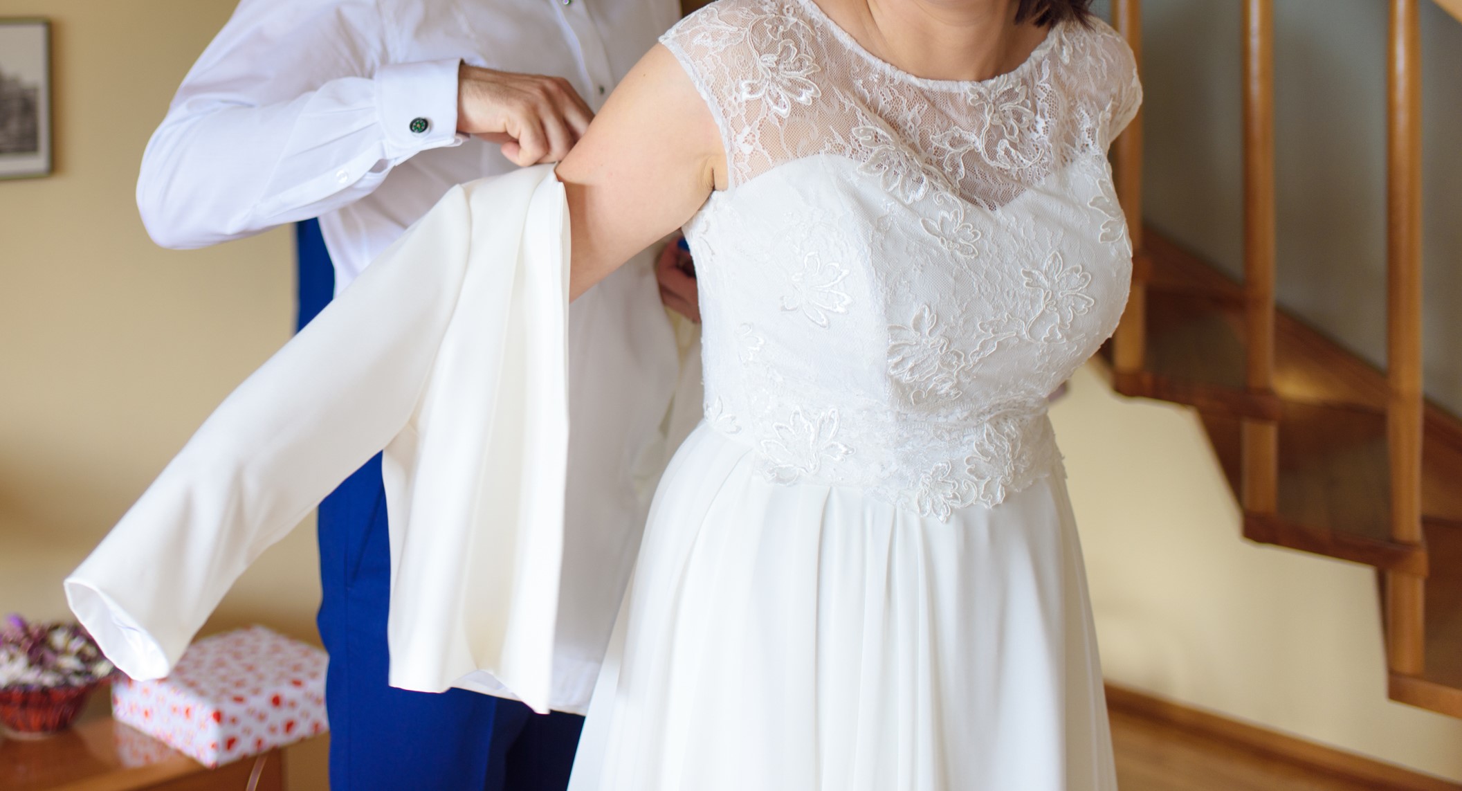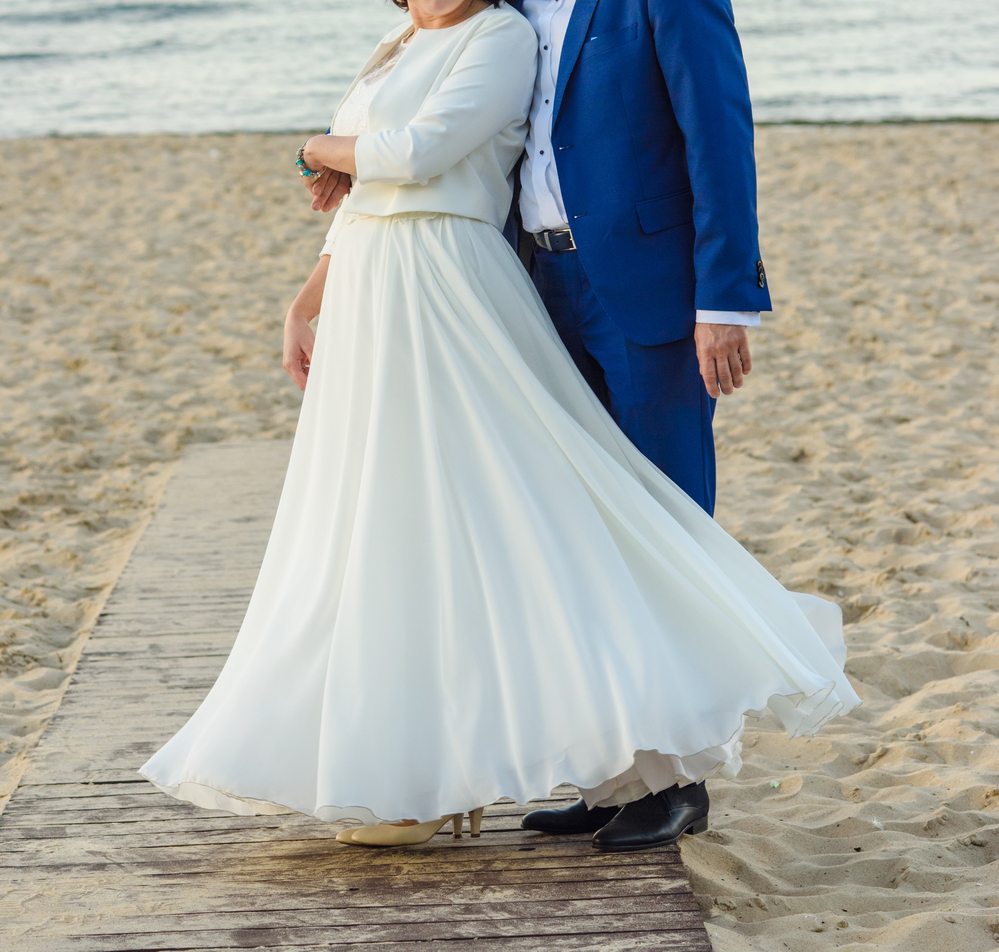 Suknia szyta na miarę. Zapinana z boku na zamek, na koronkowej doszytej koszulce ozdobne guziczki. Spódnica 3 warstwowa z muślinu. Wzrost 162 cm, obcas 5 cm, rozmiar w biuście 75F.