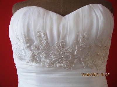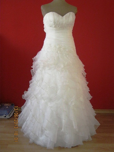 Suknia założona jeden raz, jest profesjonalnie wyczyszczona i uprasowana. Stan bardzo dobry.