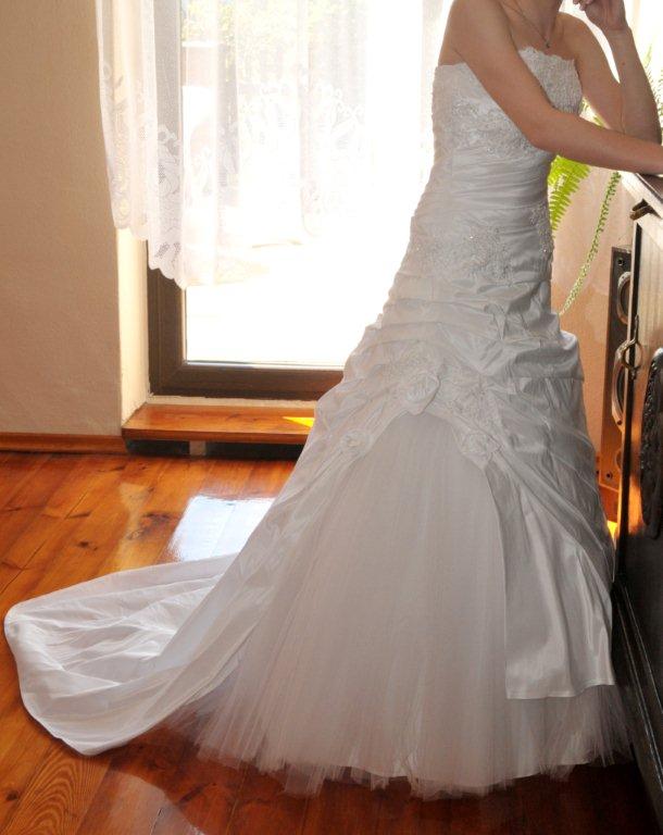 Materiał: tafta z tiulem z krótkim podpinanym trenem